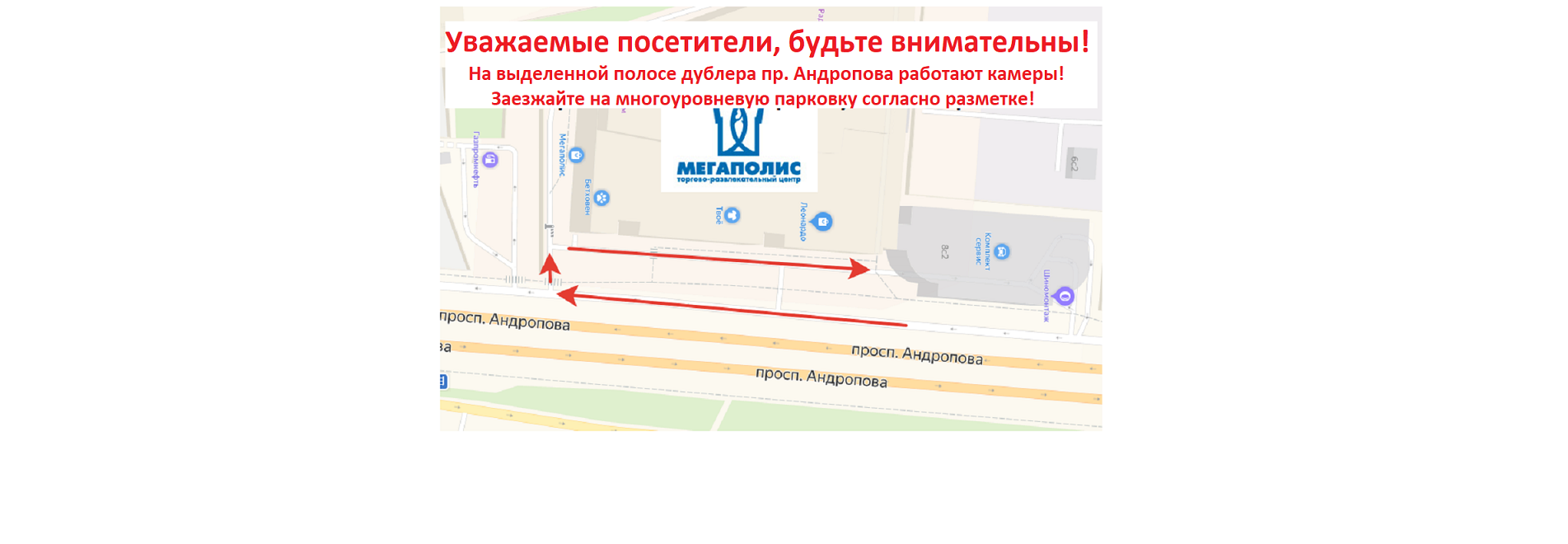 Посетители ТРЦ Мегаполис могут воспользоваться подземным паркингом на 170 машиномест или многоуровневым паркингом на 450 машиномест, также перед главным фасадом здания оборудована площадка для бесплатного паркинга на 30 машиномест.